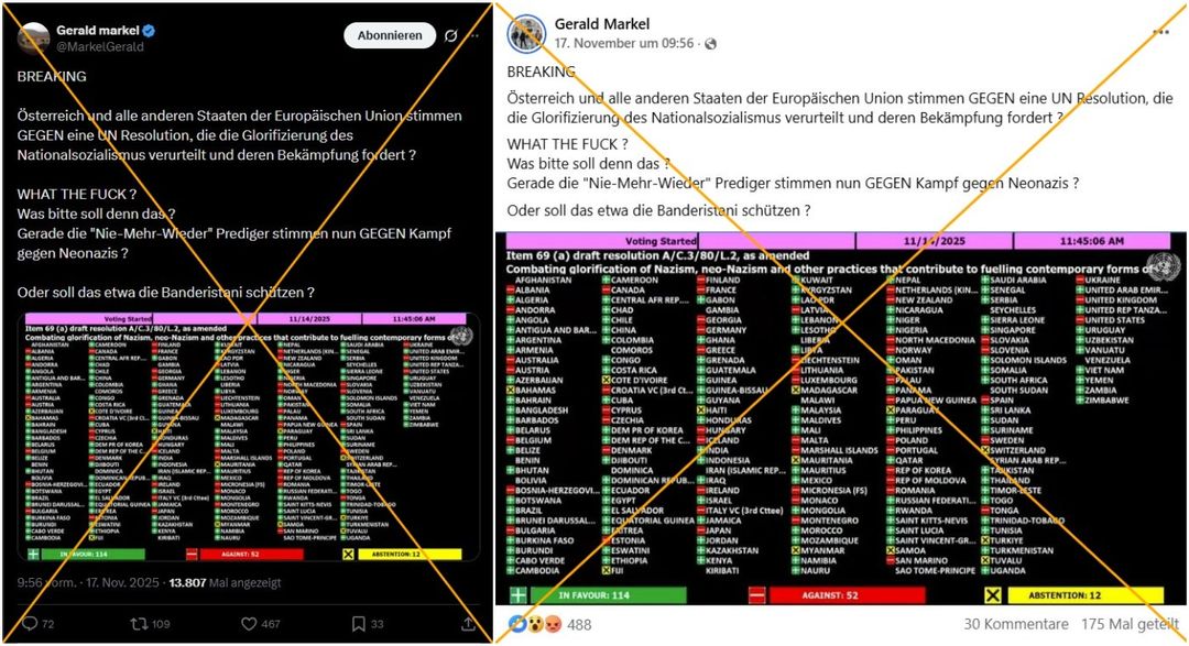 „Gerade die ‚Nie-Mehr-Wieder‘ Prediger stimmen nun GEGEN Kampf gegen Neonazis“, lautet ein Facebook-Beitrag vom 17. November 2025. Dazu ist ein Bild mit Abstimmungsergebnissen eines Votums der Vereinten Nationen (UN) angehängt. „Österreich und alle anderen Staaten der Europäischen Union stimmen GEGEN eine UN Resolution, die die Glorifizierung des Nationalsozialismus verurteilt und deren Bekämpfung fordert“, so die angebliche Eilmeldung, die 175 Mal geteilt wurde. Ein Kommentar lautet: „Österreich mit seinem Widerbetätigungsgesetz (Verbotsgesetz 1947) stimmt da zu!“ Auf X wurde die Behauptung ebenfalls geteilt.