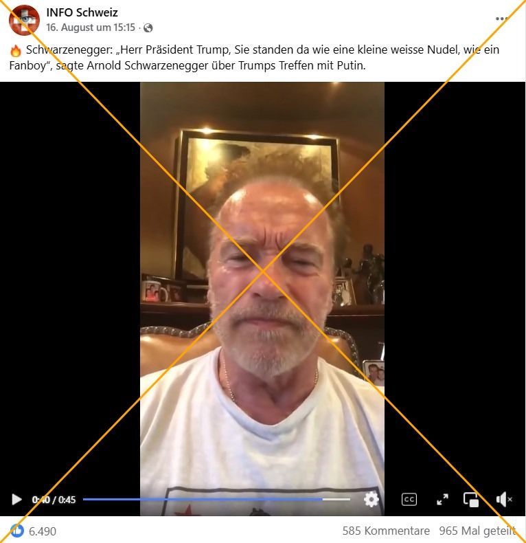 Bei den diplomatischen Bemühungen um ein Ende des seit dreieinhalb Jahren anhaltenden Ukrainekriegs blickte die ganze Welt auf ein Gipfeltreffen zwischen US-Präsident Donald Trump und seinem russischen Gegenpart Wladimir Putin Mitte August in Alaska. Wie schon in der Vergangenheit wurde Trump nach dem Treffen vorgeworfen, zu freundschaftlich mit Putin umgegangen zu sein. Online wurde behauptet, Schwarzenegger hätte Trump nach den Gesprächen in Alaska als „nasse Nudel“ bezeichnet. Doch das dazu kursierende Video stammt aus 2018.