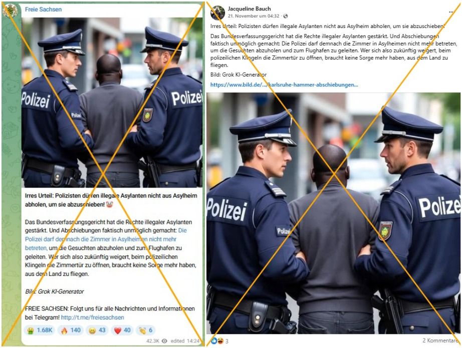 Das Bundesverfassungsgericht habe „Abschiebungen faktisch unmöglich gemacht“, schrieb die rechtsextremistische Kleinstpartei Freie Sachsen in einem Beitrag auf ihrem Telegram-Kanal, der seit 20. November 2025 mehr als 40.000 Mal angesehen wurde. Laut der Behauptung dürfte die Polizei „die Zimmer in Asylheimen nicht mehr betreten, um die Gesuchten abzuholen und zum Flughafen zu geleiten“. Der Post suggeriert, dass abgelehnte Asylbewerberinnen und -bewerber bloß nicht die Tür öffnen müssten, dann könnten sie im Land bleiben.