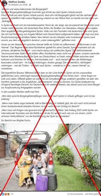 In den geteilten Postings heißt es in diesem Zusammenhang: „Während Berlin starr an der Linie festhält, Syrien sei ein unzumutbar gefährliches Land, verbringen tausende Bürgergeldempfänger ihre Ferien dort – ohne Angst um Leib und Leben. Offiziell gelten sie weiterhin als Schutzbedürftige, praktisch genießen sie aber den Komfort, jederzeit in die angebliche ‚Gefahrenzone‘ reisen zu können.“ Dass Menschen ihren Urlaub genehmigen lassen müssen, um weiter Bürgergeld zu beziehen, wird nicht erwähnt.