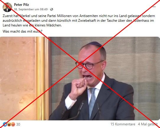 In sozialen Medien teilten Userinnen und User ein Bild, das Merz besonders verzweifelt aussehen lässt. „Meine Großmutter war Jüdin! Ich glaube sie würde sich für so eine Memme schämen!“, schrieb etwa ein User am 17. September 2025 auf X. Ein anderer schrieb spöttisch auf Facebook, Merz würde in dem Bild „künstlich mit Zwiebelsaft in der Tasche über den Judenhass im Land heulen wie ein kleines Mädchen“.