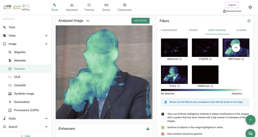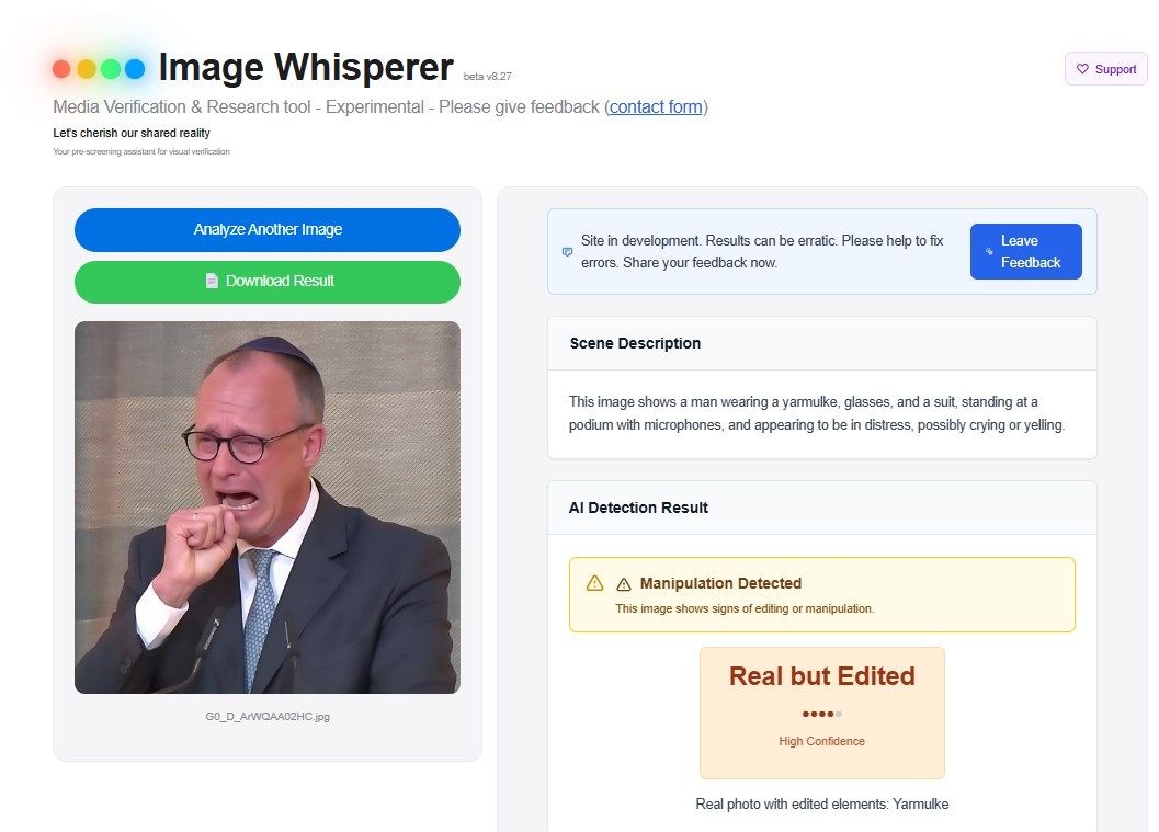 Denis Teyssou, Leiter der Innovationsabteilung für die Projekte InVID und WeVerify bei AFP, fand am 23. September 2025 mithilfe mehrerer KI-Erkennungstools ebenfalls Anzeichen dafür, dass das Bild manipuliert wurde. Das Projekt „vera.ai“ ist eine europäische Forschungs- und Innovationsinitiative, an der AFP Medialab beteiligt ist. „Wir prüfen derzeit noch, welche Modelle allen unseren fortgeschrittenen Nutzerinnen und Nutzern zur Verfügung gestellt werden sollen“, sagte Teyssou.