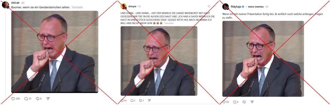 Doch ein Vergleich mit Original-Mitschnitten aus mehreren Perspektiven ergab, dass Merz während seiner Rede keinen solchen Gesichtsausdruck machte, wie in sozialen Medien illustriert. Mehrere Elemente im Bild liefern zudem Hinweise auf eine Bearbeitung mithilfe von Künstlicher Intelligenz (KI). Im Umlauf waren weitere Versionen der Szene etwa auf X sowie in unterschiedlicher Form auf Tiktok.