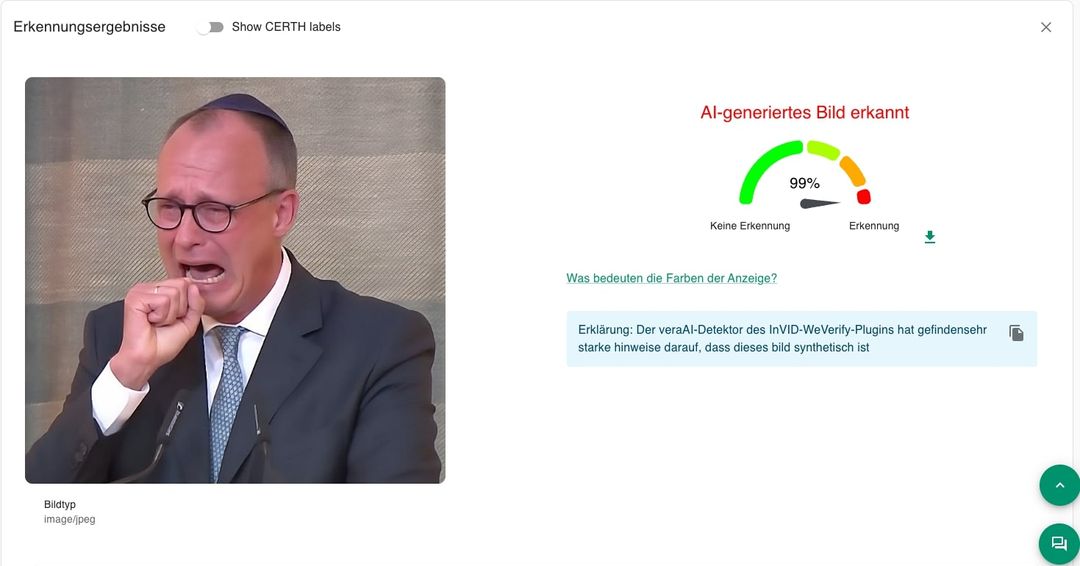 AFP untersuchte das Bild ebenfalls mithilfe des Verifizierungstools InVid-WeVerify. Die Analyse ergab mit einer Erkennungsrate von 99 Prozent, dass das Bild mittels KI erzeugt wurde.