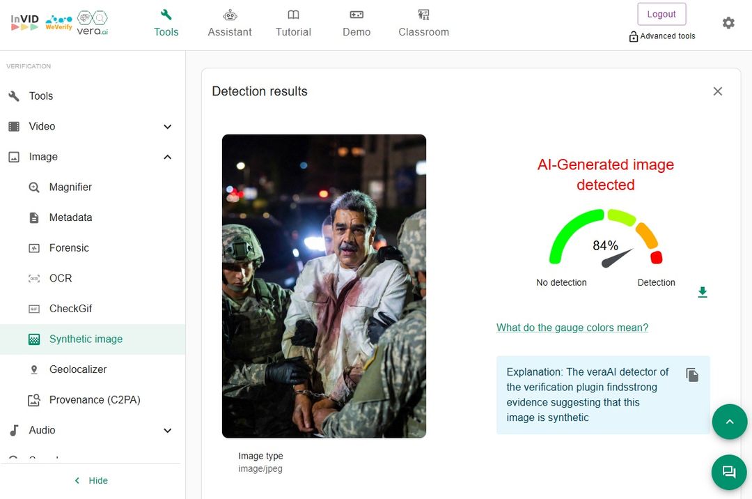 Auf die Gefangennahme des entmachteten venezolanischen Staatschefs Nicolás Maduro und seiner Frau am 3. Januar 2026 durch eine US-Spezialeinheit folgten massenhaft Falschinformationen in sozialen Medien. Unter anderem teilten Nutzerinnen und Nutzer ein Bild, auf dem Maduro in Handschellen und einem blutbefleckten Hemd zu sehen ist. Auch ein Bilddienst stellte die angebliche Aufnahme seinen Medienkunden zur Verfügung. Eine Analyse des Bildes ergab visuelle Fehler, die darauf hindeuten, dass es mit Künstlicher Intelligenz generiert wurde. Auch Erkennungstools sowie der Bilddienst selbst bestätigten, dass das Bild KI-generiert ist.