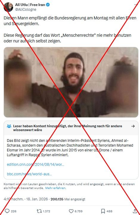 „Diesen Mann empfängt die Bundesregierung am Montag mit allen Ehren und Steuergeldern. Diese Regierung darf das Wort ‚Menschenrechte‘ nie mehr benutzen oder nur auf sich selbst zeigen“, schrieb ein Nutzer am 18. Januar 2026 auf X und teilte ein Bild eines bärtigen Mannes, der lächelnd in beiden Händen jeweils einen abgetrennten Kopf hält. Die Köpfe sind auf dem Foto unkenntlich gemacht. Der Nutzer bezog sich dabei auf den für den 20. Januar 2026 geplanten Besuch des syrischen Übergangspräsidenten Ahmed al-Scharaa in Berlin.