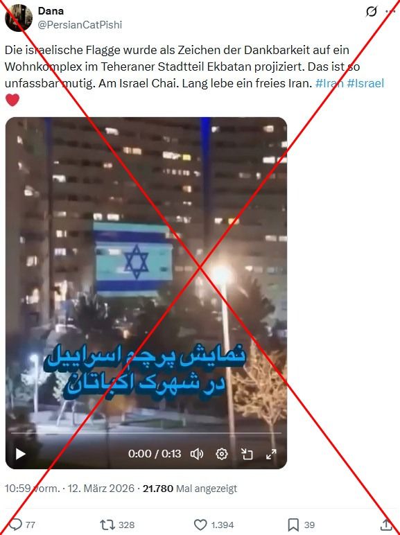 In einem Video wird eine israelische Flagge auf einen mehrstöckigen Wohnkomplex projiziert. Die Person, die filmt, scheint in einem Auto vorbeizufahren, während im Hintergrund begeistertes Pfeifen zu hören ist. „Die israelische Flagge wurde als Zeichen der Dankbarkeit auf ein Wohnkomplex im Teheraner Stadtteil Ekbatan projiziert. Das ist so unfassbar mutig“, heißt es in einem X-Beitrag vom 12. März 2026, in dem das Video geteilt wird.