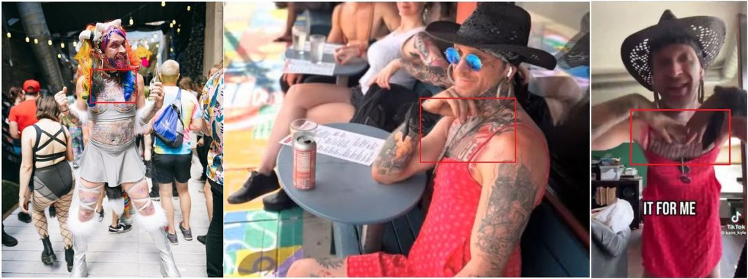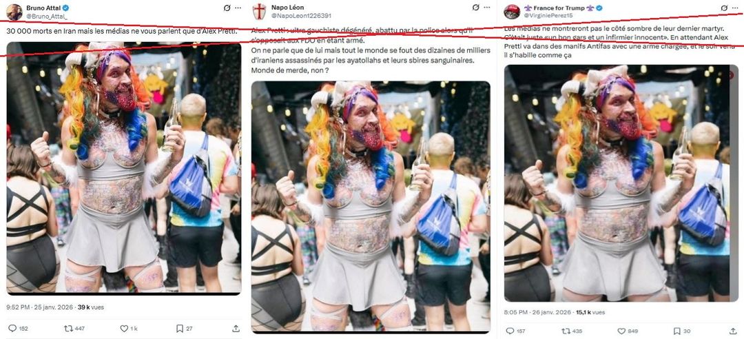 Auf Englisch und Französisch wurde ein weiteres Bild verbreitet, das den Behauptungen zufolge angeblich Alex Pretti zeigen sollte. Darauf ist eine Person mit buntem Bart, bunter Perücke, knappem Oberteil und kurzem Rock zu sehen. Neben dem Bild teilten Nutzerinnen und Nutzer häufig homophobe Äußerungen oder bezeichneten Pretti als „Ultra-Linken“ und Mitglied der „Antifa“. Im November 2025 hatte US-Präsident Trump die deutsche „Antifa-Ost“ sowie drei weitere europäische Gruppierungen auf die US-Terrorliste gesetzt.