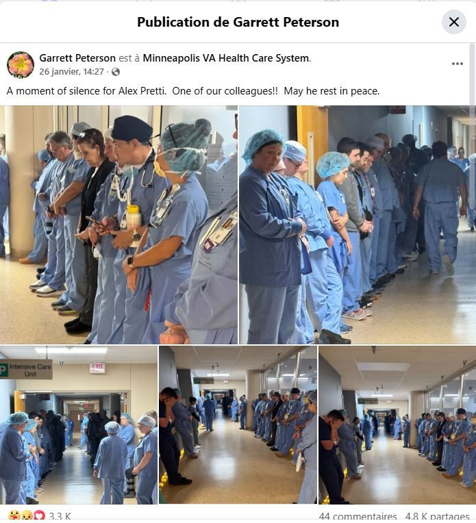 Die englischsprachige Faktencheck-Organisation Snopes veröffentlichte einen Artikel zu demselben Video und zitierte dabei einen Facebook-Beitrag, der eine authentische Hommage an Alex Pretti zu zeigen scheint. Der Nutzer, der das Video veröffentlichte, verortete es im Veteranenkrankenhaus von Minneapolis und versah es mit der Beschreibung: „Eine Schweigeminute für Alex Pretti. Einer unserer Kollegen!! Möge er in Frieden ruhen.“