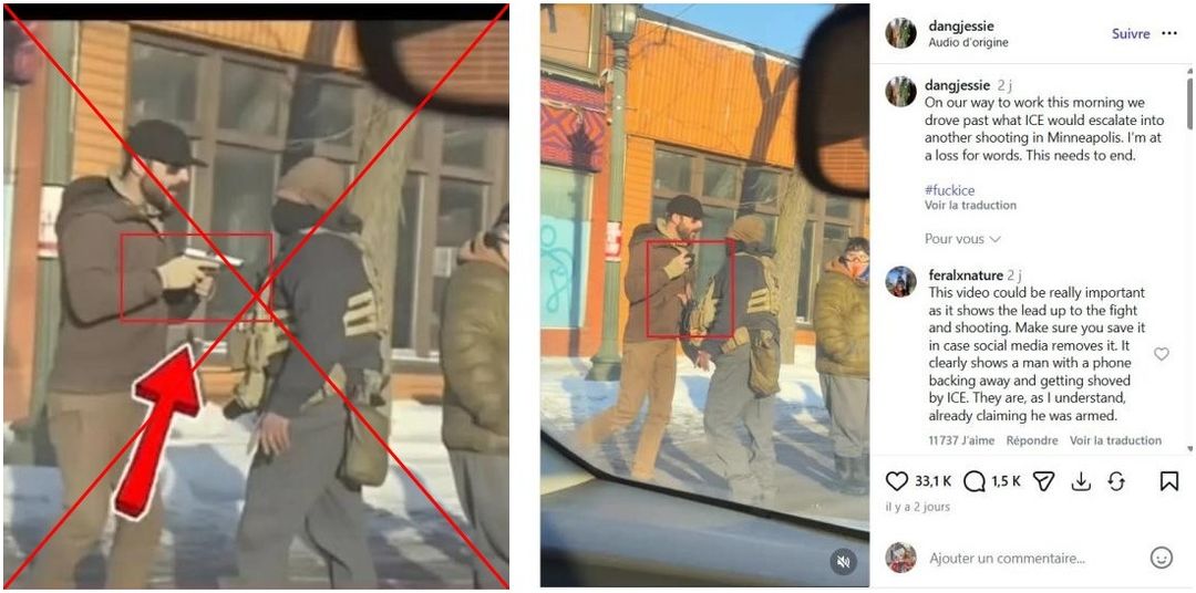 Eine Aufnahme, in der Pretti angeblich einen der anwesenden Beamten mit einer Waffe bedroht, wurde vielfach in sozialen Medien auf Französisch geteilt. Darin ist der Krankenpfleger Pretti mit einer Pistole in der Hand zu sehen, die er auf die Brust des vermummten Beamten zu richten scheint. Einige Nutzerinnen und Nutzer behaupteten, Pretti hätte das Feuer auf die Beamten eröffnet.