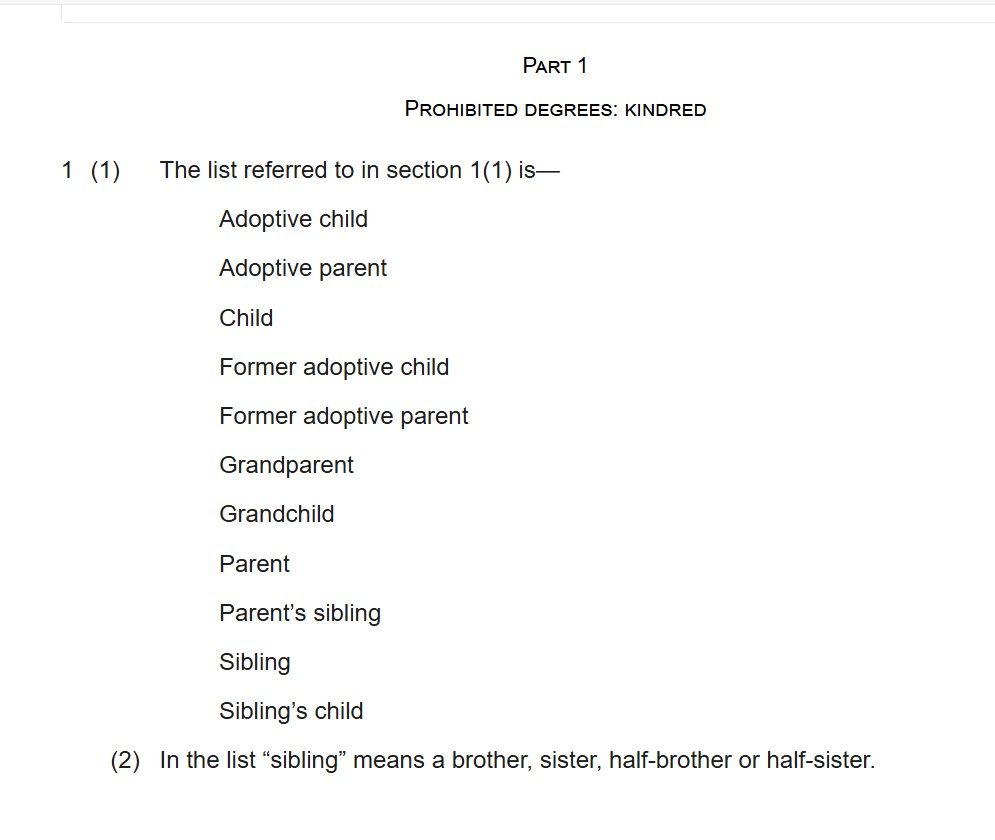 Screenshot der Liste der sogenannten verbotenen Beziehungen in der neuesten Fassung des britischen Ehegesetzes: 8. Oktober 2025