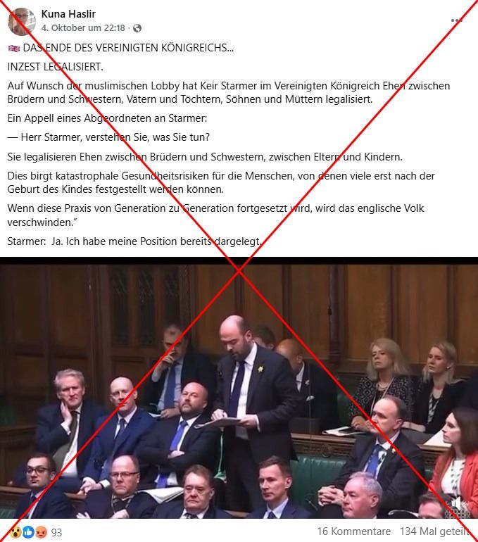 „Auf Wunsch der muslimischen Lobby hat Keir Starmer im Vereinigten Königreich Ehen zwischen Brüdern und Schwestern, Vätern und Töchtern, Söhnen und Müttern legalisiert“, lautete eine Falschnachricht, die Anfang Oktober 2025 online mehrfach verbreitet wurde. Eine Facebook-Userin behauptete etwa am 4. Oktober 2025 in einem mehr als hundertfach geteilten Beitrag, dies bedeute „das Ende des Vereinigten Königreichs“.