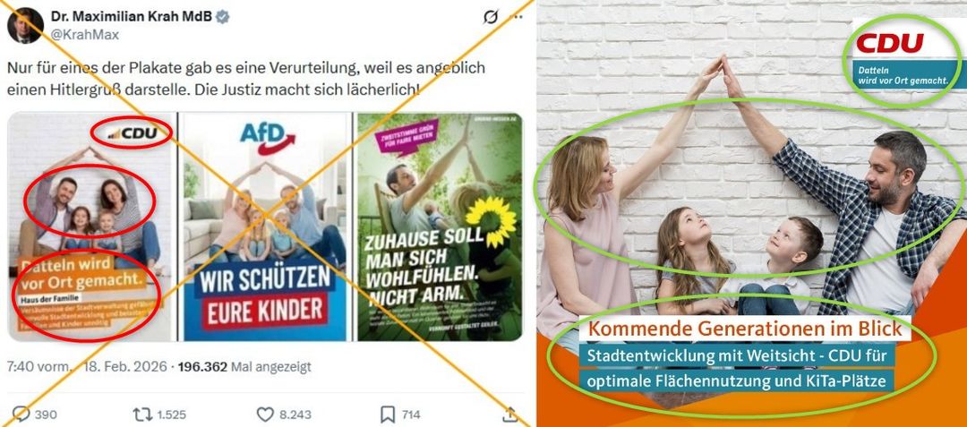 Das angebliche AfD-Plakat wurde in der Collage mit einem Plakat mit CDU-Logo verglichen. Darauf sind ebenfalls zwei Erwachsene zu sehen, die mit ihren Armen ein Dach über zwei Kindern in ihrer Mitte formen. „Datteln wird vor Ort gemacht“, ist darunter zu lesen. Auf eine AFP-Anfrage antwortete Patrick-Benjamin Bök, Fraktions- und Stadtverbandsvorsitzende der CDU Datteln, dass das Plakat „kein Logo der CDU Deutschlands verwendet“. Er erklärte am 27. Februar 2026: „Die Welle vor dem Schriftzug ‚CDU‘ hat vier Elemente und nicht, wie in unserem Logo, nur drei. Es stammt also nicht von uns.“ Das angebliche CDU-Motiv „scheint somit ein Fake beziehungsweise Nachbau zu sein, um dem AfD-Post möglichst ähnlich zu sein“.