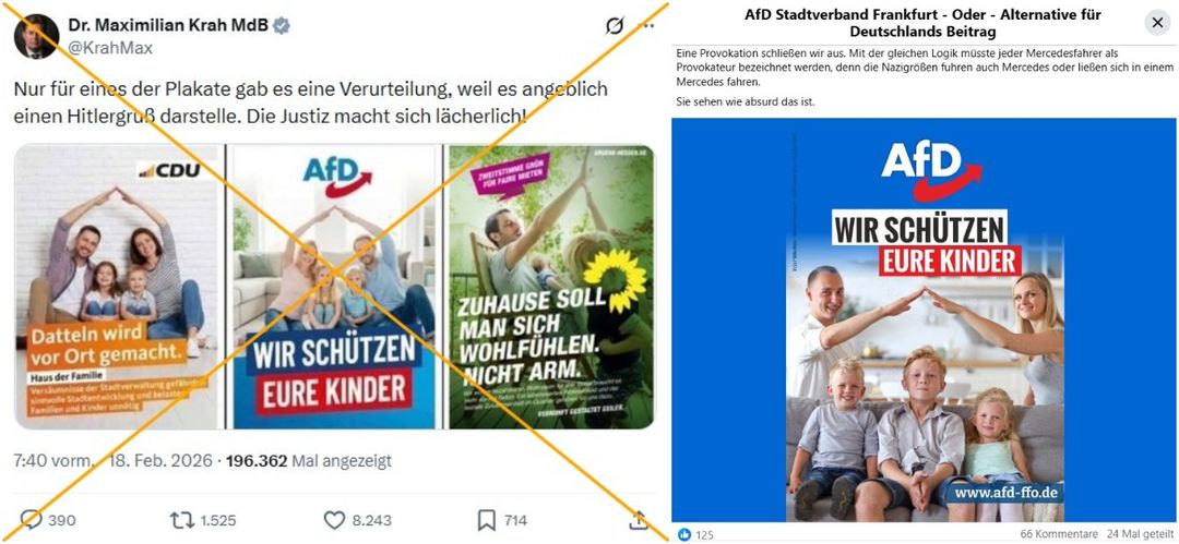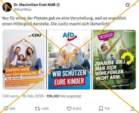 „Nur für eines der Plakate gab es eine Verurteilung, weil es angeblich einen Hitlergruß darstelle“, schrieb der AfD-Bundestagsabgeordnete Maximilian Krah am 18. Februar 2026 auf X. „Die Justiz macht sich lächerlich!“ Dazu postete er eine Collage dreier Wahlplakate: Auf den angeblichen Plakaten der CDU und der AfD formen jeweils ein Mann und eine Frau ein Dach über den Köpfen zweier Kinder. Auf dem dritten Plakat mit dem Logo der Grünen gibt ein Mann einem Kind High Five.