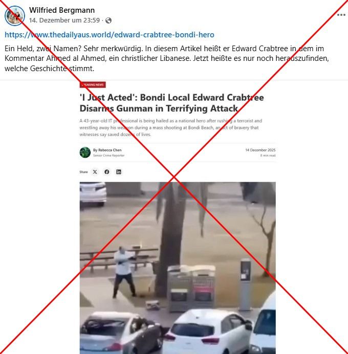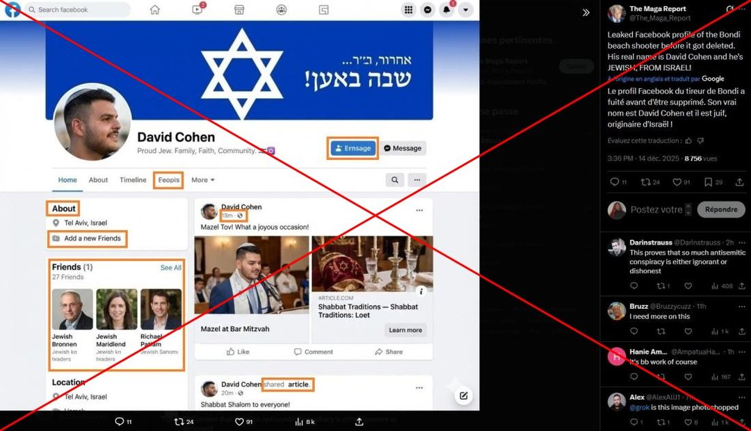 Ein Screenshot zeige ein „durchgesickertes Facebook-Profil des Schützen von Bondi Beach, bevor es gelöscht wurde. Sein richtiger Name ist David Cohen und er ist JÜDISCH, AUS ISRAEL“, schrieb ein Nutzer am 15. Dezember 2025 auf Facebook. Ähnliche Behauptungen wurden auch auf X sowie auf anderen Sprachen wie Englisch, Französisch und Türkisch verbreitet.