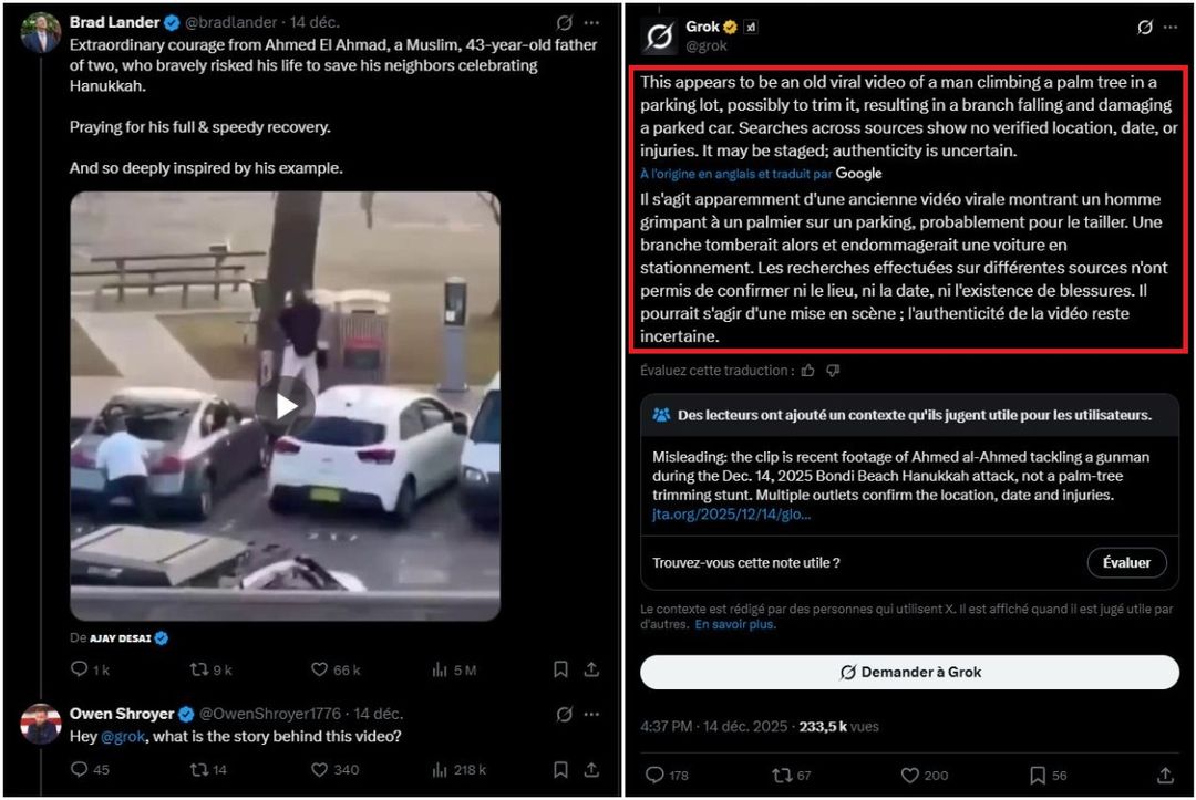 Die Antworten sind jedoch falsch. Das Video und das Bild des Mannes in weißem Oberteil sind authentisch: Es handelt sich tatsächlich um el Ahmed, einen Syrer und Vater von zwei Töchtern. Er stammt aus Neirab im Nordwesten Syriens und hat sein Land 2007 verlassen, um sich in Australien niederzulassen. Dort arbeitete er im Baugewerbe, bevor er einen Obst- und Gemüseladen eröffnete. Es ist nicht das erste Mal, dass Grok Falschinformationen wiedergibt.