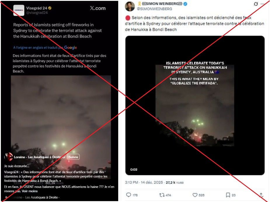 Am Abend nach dem Anschlag teilten Internetnutzerinnen und -nutzer beispielsweise auf X ein Video eines Feuerwerks in einem Vorort von Sydney und behaupteten, dieses würde zeigen, wie „Muslime“ den tödlichen Angriff feiern würden. Auch auf Englisch und Französisch wurde das Video verbreitet.