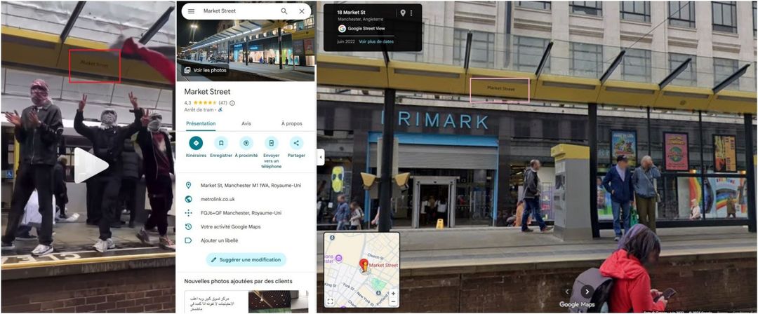 Mithilfe einer umgekehrten Bildsuche konnte AFP den Ort der Demonstration lokalisieren: Im Video ist die Straßenbahnhaltestelle Market Street in Manchester in Großbritannien zu erkennen.