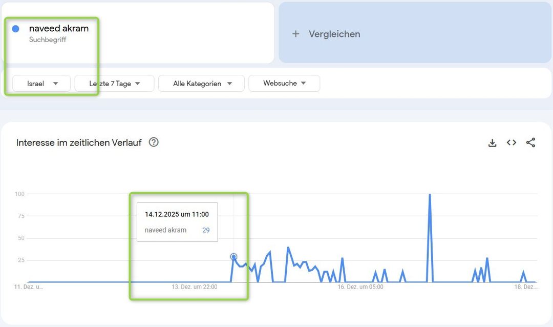 Den Daten von Google Trends zufolge erreichten die Suchanfragen im Zusammenhang mit dem Namen des mutmaßlichen Angreifers „Naveed Akram“ einen ersten Höhepunkt gegen elf Uhr in Tel Aviv in Israel, also eineinhalb Stunden nach dem antisemitischen Anschlag und nicht am Tag zuvor.