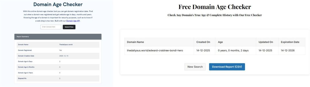 Zum einen funktionieren keine der Links oder Rubriken auf der Website. Zum anderen ergab eine Überprüfung des Registrierungsdatums der Domain, dass die Website am 14. Dezember 2025 registriert wurde. Das legt die Vermutung nahe, dass die Website nur für den Zweck erstellt wurde, diese Falschmeldung zu verbreiten.