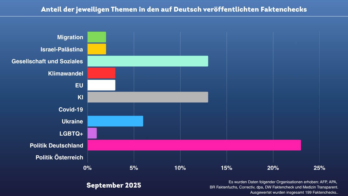 Ein Grund sind Social-Media-Posts mit Falschinformationen, die sich die Prominenz führender Politiker wie Bundeskanzler Friedrich Merz (CDU) zunutze machen. Auffällig auch der lange Balken zum Thema KI – gemeint sind Faktenchecks, die sich mit durch KI erstellten oder mit KI manipulierten Inhalten befassen. Denn vor etwa einem Jahr war das Thema KI zwar schon in aller Munde war, im Alltag der Faktencheck-Organisationen war der Anteil derartiger Inhalte aber eher klein. Solche Entwicklungen lassen sich von jetzt an jeden Monat über den GADMO-Brief nachvollziehen.