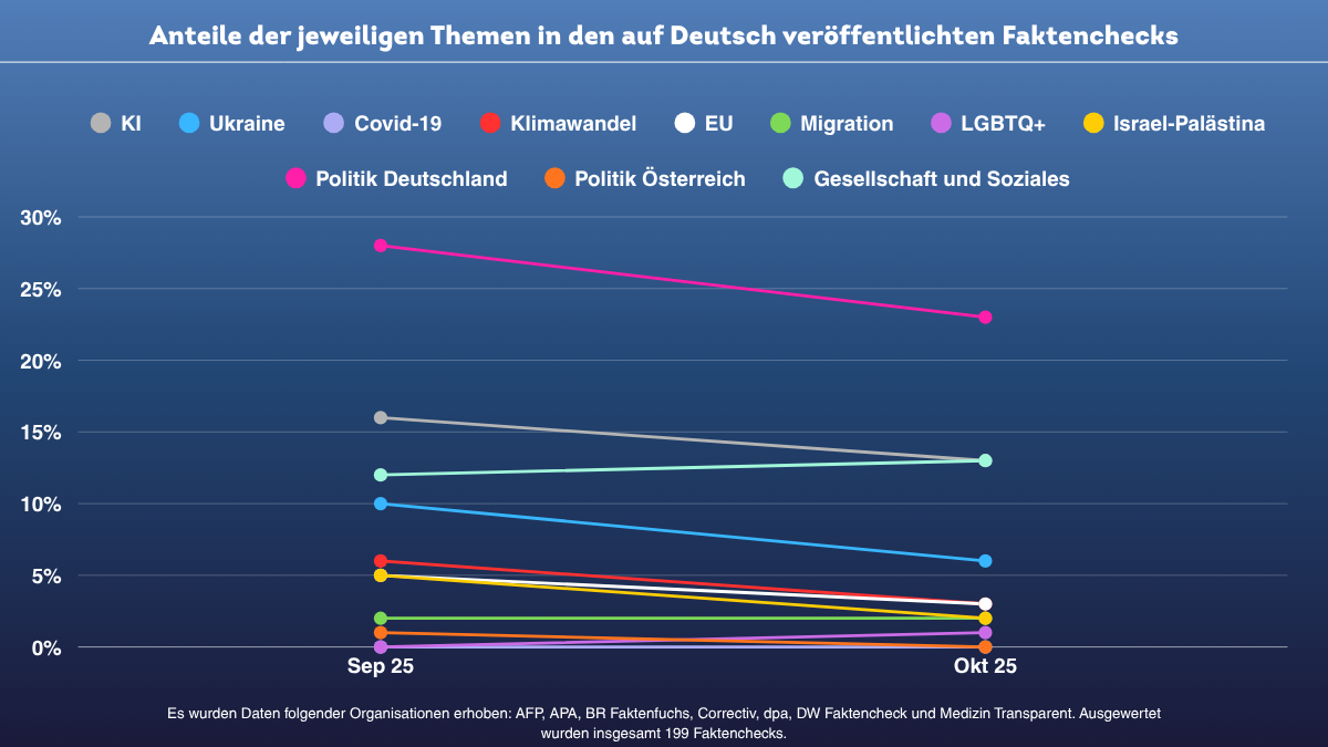 Aber wir sind gespannt darauf, was sich zeigt, wenn in den kommenden Monaten die Datenpunkte für November, Dezember und Januar dazukommen. Eine so banale wie wichtige Erkenntnis: Faktenchecks widmen sich Themen, die gesellschaftlich relevant sind. Politik Deutschland ist zum zweiten Mal in Folge die stärkste Kategorie. Themen aus dem Bereich Gesellschaft und Soziales spielen weiterhin eine deutlich sichtbare Rolle. Auch vorne dabei: Unsere einzige nicht-inhaltliche Kategorie „KI“. Hier erfassen wir Falschinformationen, in denen KI-Tools eine wesentliche Rolle gespielt haben. Meistens geht es dabei um Bild- oder Videomanipulation.