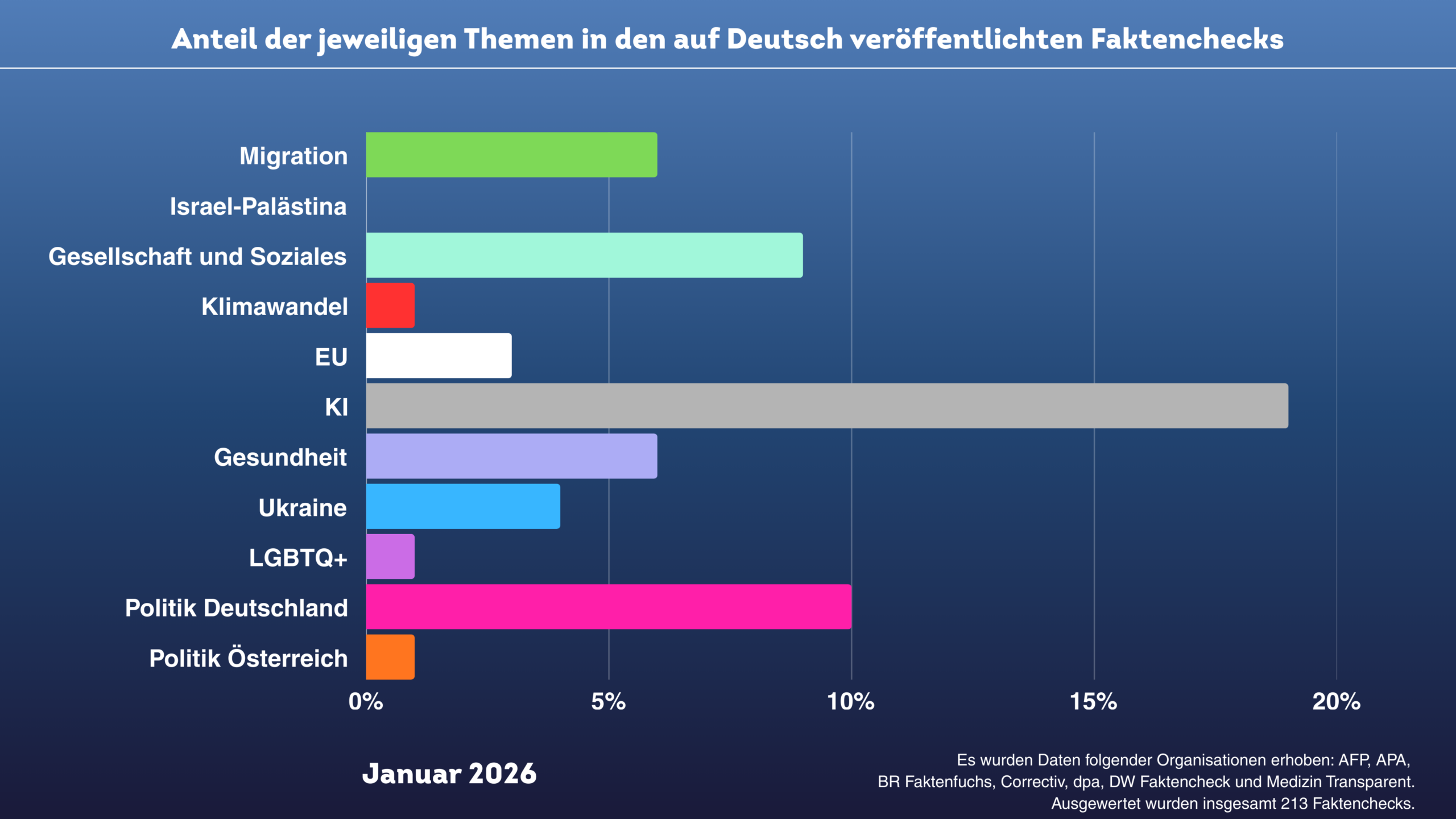 Die Auswertung für Januar 2026 basiert auf 213 deutschsprachigen Faktenchecks von EFCSN oder IFCN zertifizierten Organisationen. Sie zeigt, mit welchen Themen und Fragestellungen sich Faktencheck-Redaktionen zu Jahresbeginn besonders häufig befasst haben. Die zugrunde liegenden Grafiken bilden dabei keine gesellschaftliche Realität ab, sondern spiegeln ausschließlich die redaktionelle Arbeit der beteiligten Organisationen.