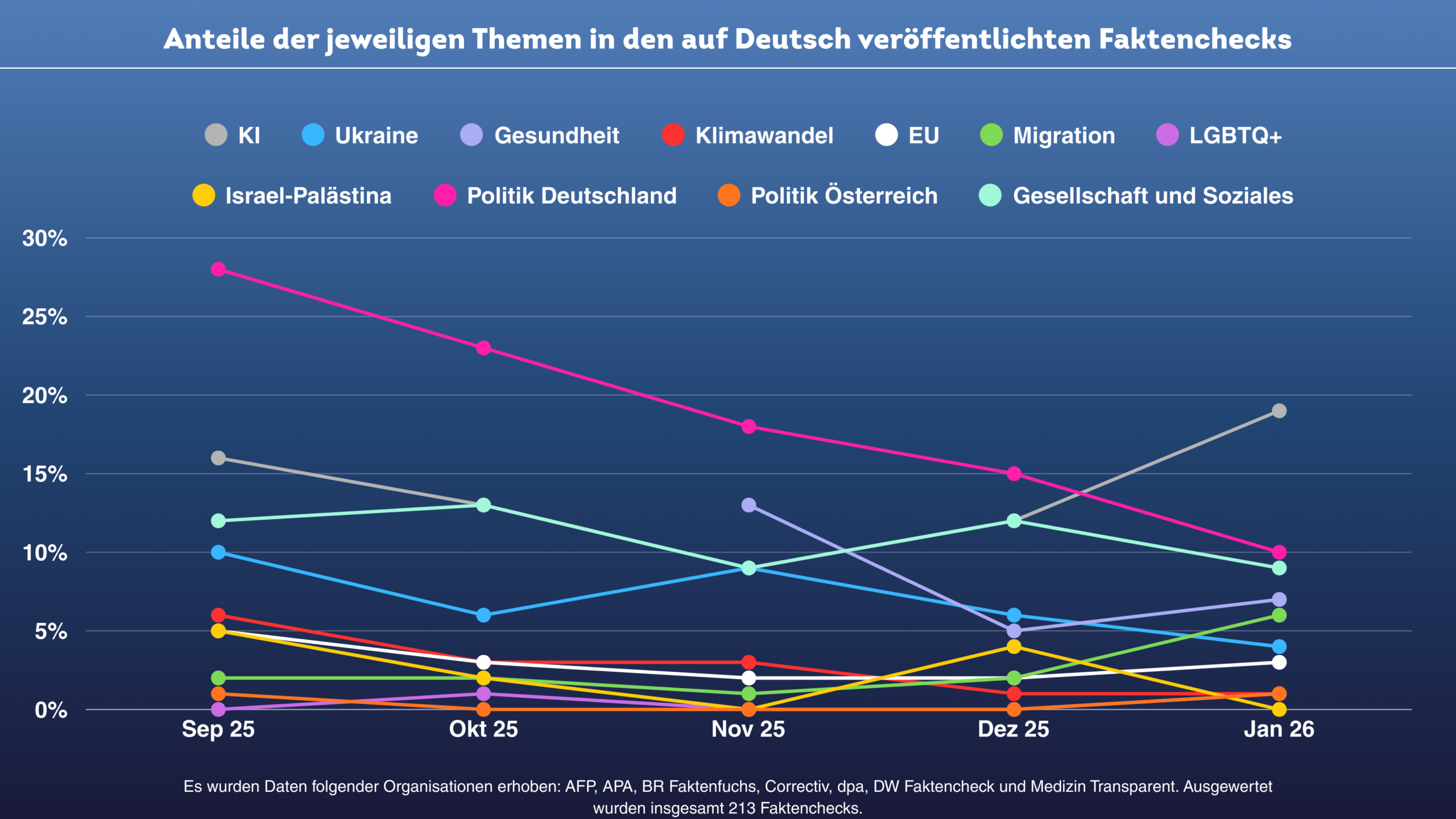 Auffällig ist, wie stark sich die Faktenchecks im Januar um Fragen rund um Künstliche Intelligenz drehen – vor allem mit Blick auf KI-generierte oder mit KI-Unterstütztung manipulierte Inhalte, aber auch in Bezug auf die Rolle von KI-Systemen in der Informationsumgebung. Ebenfalls deutlich präsent ist Politik in Deutschland; daneben tauchen gesellschaftliche Themen regelmäßig auf.