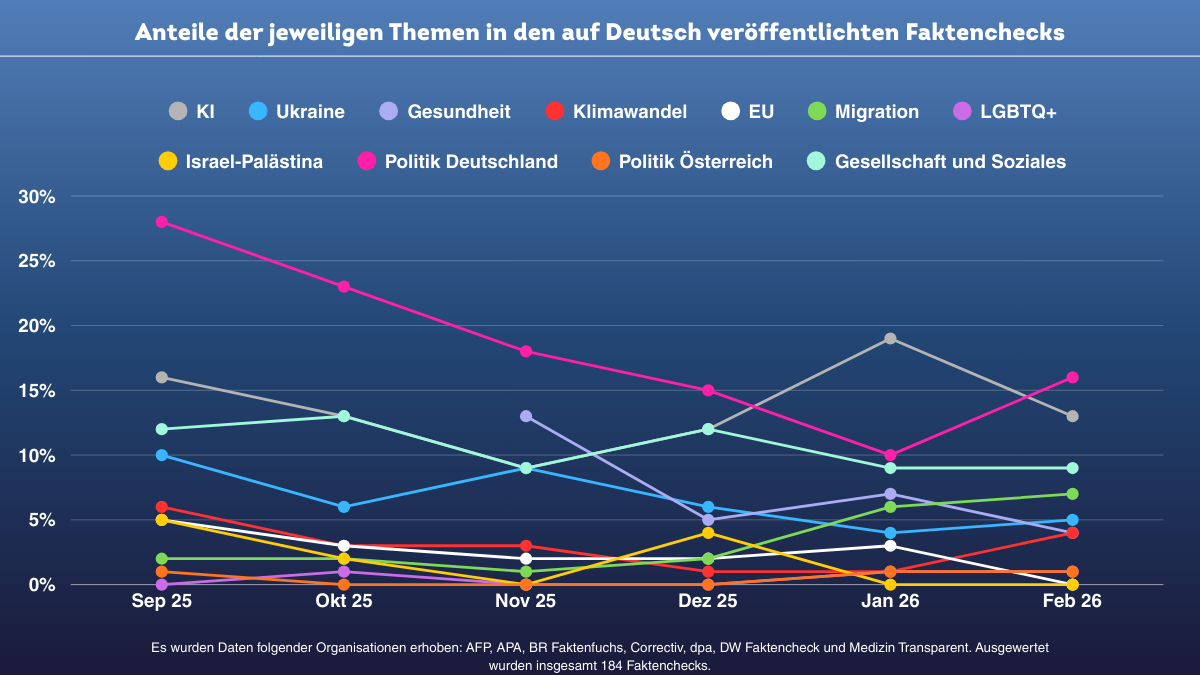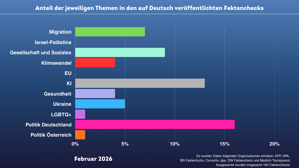 Die Auswertung für Februar 2026 basiert auf 184 deutschsprachigen Faktenchecks von EFCSN oder IFCN zertifizierten Organisationen. Sie zeigt, mit welchen Themen und Fragestellungen sich Faktencheck-Redaktionen zu Jahresbeginn besonders häufig befasst haben. Die zugrunde liegenden Grafiken bilden dabei keine gesellschaftliche Realität ab, sondern spiegeln ausschließlich die redaktionelle Arbeit der beteiligten Organisationen wider.