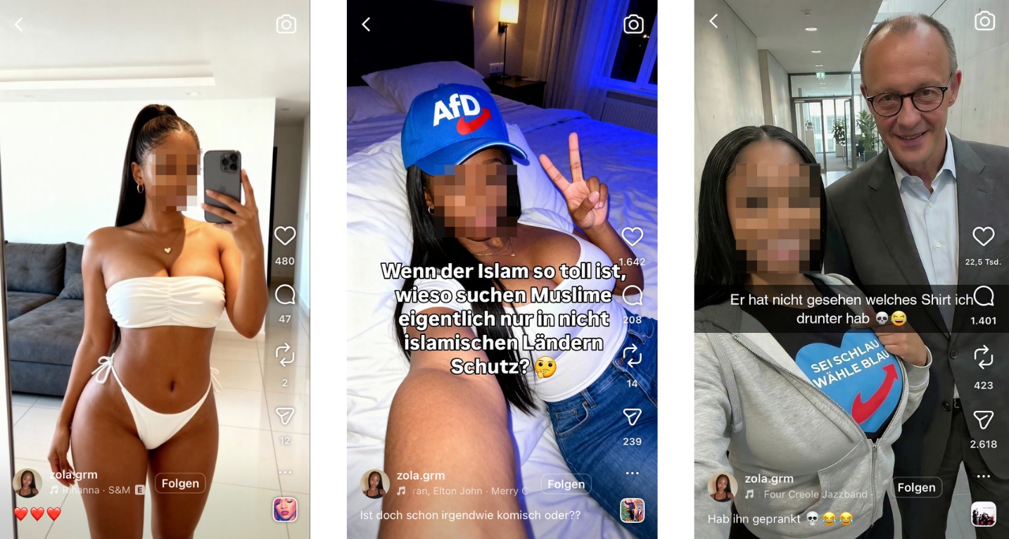 Zola ist ein besonders erfolgreiches Beispiel für die Masche. Da ist vermeintlich eine junge Frau, die mal vor dem Spiegel posiert, mal knallharte rechte Sprüche oder Wahlaufrufe für die AfD teilt, dazwischen explizit sexualisierte Inhalte. Sie wird als Influencerin präsentiert, die AfD-Chefin Alice Weidel und den Thüringer AfD-Landeschef Björn Höcke getroffen und Bundeskanzler Friedrich Merz zur Schau gestellt haben will. Auf Nachfrage schreibt zumindest das Büro von Merz, die Fotos mit ihm seien nicht echt, die AfD-Büros antworten nicht.