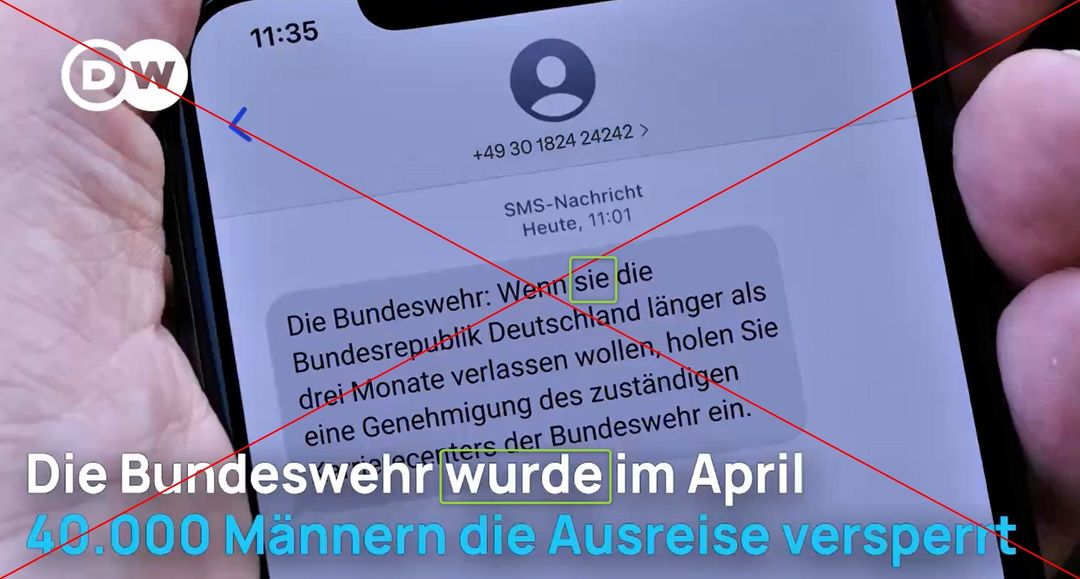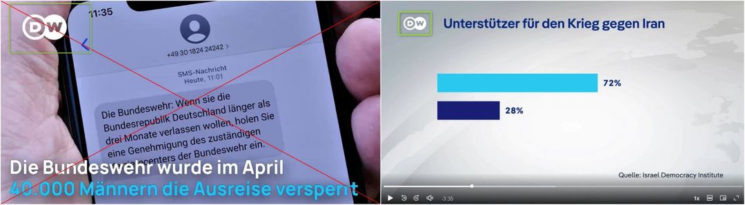 In sozialen Medien kursierte ein Video, das an einen Bericht des Mediums Deutsche Welle erinnert. Im Video wird unter anderem fälschlich behauptet, dass in Deutschland im April 2026 mehr als 40.000 Männern die Ausreise an Flughäfen verweigert wurde. Das Video weist jedoch Fehler auf, die auf eine Fälschung hindeuten. Die Deutsche Welle bestätigte AFP, dass es sich tatsächlich um eine Nachahmung handelt und das Logo missbräuchlich genutzt wurde. Das deutsche Verteidigungsministerium dementierte zudem die im Video vorkommenden Behauptungen.