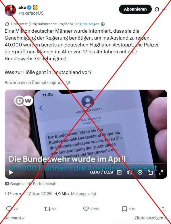 Ein weiterer X-User wiederholte am 17. April 2026 auf Englisch die Behauptungen: „40.000 wurden bereits an deutschen Flughäfen gestoppt. Die Polizei überprüft nun Männer im Alter von 17 bis 45 Jahren auf eine Bundeswehr-Genehmigung. Was zur Hölle geht in Deutschland vor?“ Der vielfach gelikte Beitrag ist mit dem Hinweis versehen, dass es sich hier um eine „Gesponserte Partnerschaft“ handelt, was bedeutet, dass dieser Nutzer potenziell für die Veröffentlichung des Inhalts bezahlt wurde.
