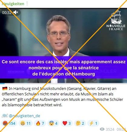 „In Hamburg sind Musikstunden (Gesang, Klavier, Gitarre) an öffentlichen Schulen nicht mehr erlaubt, da Musik im Islam als ‚haram‘ gilt und das Aufzwingen von Musik an muslimische Schüler als Islamophobie betrachtet wird“, heißt es in einem Telegram-Beitrag vom 1. Oktober 2025. Darin wurde ein Video verbreitet, in dem ein Nachrichtensprecher über Diskriminierung durch muslimische Schülerinnen und Schüler in Hamburg spricht und berichtet, dass einige nicht am Musikunterricht teilnehmen würden, weil dieser „haram“, also dem islamischen Glauben zufolge verboten, ist.