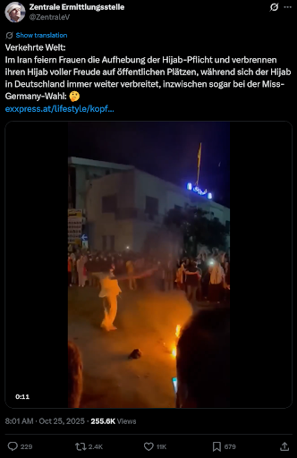 Im Iran sei die Hijab-Pflicht aufgehoben worden, woraufhin die Frauen vor Ort ihre Kopftücher in den Straßen verbrannt hätten, heißt es Ende Oktober in einem Beitrag des Accounts „Zentrale Ermittlungstelle“ auf X mit 250.000 Aufrufen. Der Account verbreitet regelmäßig insbesondere pro-russische Desinformation. Die deutschen Medien würden über die Aufhebung der Hijab-Pflicht schweigen, schreibt er in einem weiteren Beitrag. Die Behauptung und das Video kursieren international.