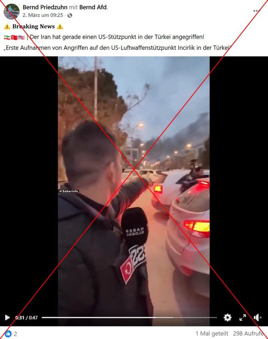 „Erste Aufnahmen von Angriffen auf den US-Luftwaffenstützpunkt Incirlik in der Türkei“, lautet die Beschreibung eines Facebook-Posts vom 2. März 2026. Dazu teilte ein User ein 47-sekündiges Video, das einen Journalisten zeigt, der auf seiner Jacke eine türkische Flagge trägt. Er scheint den Clip selbst aufzunehmen, während im Hintergrund Rauch aufsteigt.