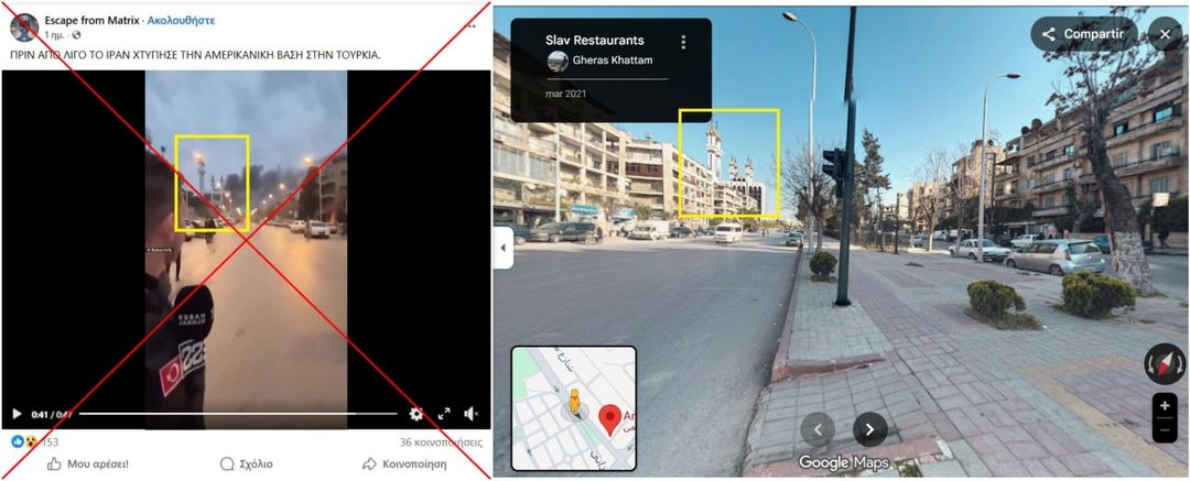 Vergleich zwischen der auf Facebook geteilten Behauptung mit dem Video (links) und einem Screenshot von Google Street View. Rotes Kreuz und gelbe Markierungen von AFP hinzugefügt: 3. März 2026