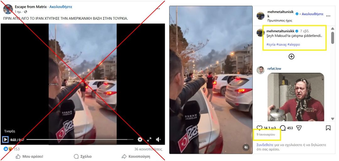 Vergleich zwischen der auf Facebook geteilten Behauptung mit dem Video (links) und dem Originalbeitrag auf Instagram (rechts). Rotes Kreuz und gelbe Markierungen von AFP hinzugefügt: 3. März 2026