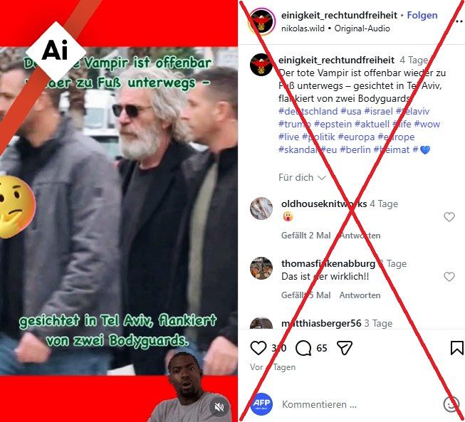 „Der tote Vampir ist offenbar wieder zu Fuß unterwegs – gesichtet in Tel Aviv, flankiert von zwei Bodyguards“, heißt es in einem Instagram-Beitrag vom 6. Februar 2026, in dem ein Foto eines Mannes mit weißem Haar und weißem Bart sowie daneben ein Bild des verurteilten Sexualstraftäters Jeffrey Epstein geteilt wird. Als Hashtag wird Epstein erwähnt – mit „Vampir“ wird offenbar auf den Finanzier angespielt, der 2019 in Untersuchungshaft in New York City Suizid beging.