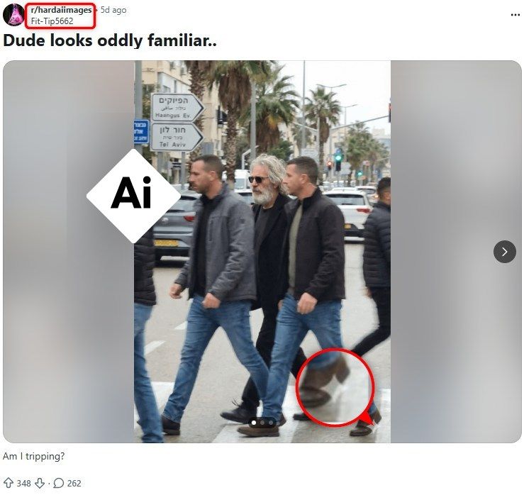 Ein weiterer Hinweis darauf, dass es sich bei dem Bild um eine KI-generierte Fälschung handelt, ist die falsche Platzierung des grünen Signals der Verkehrsampel an jener Stelle, wo sich normalerweise das rote Signal befindet. Außerdem ist auf einem Verkehrsschild eine fehlerhafte hebräische Übersetzung für „Tel Aviv“ zu lesen.