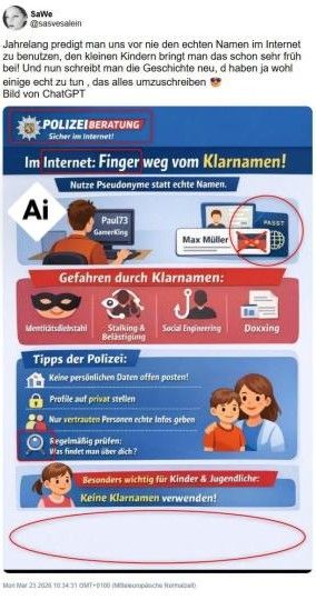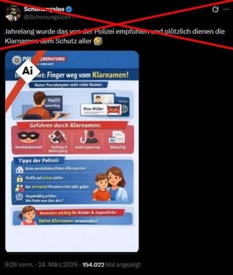 „Finger weg vom Klarnamen!“, lautet die Überschrift der Infografik, die ein X-Nutzer teilte und die von der Polizei in Deutschland erstellt worden sein soll. Das Posting wurde seit dem 24. März 2026 hunderttausendfach angesehen. „Jahrelang wurde das von der Polizei empfohlen und plötzlich dienen die Klarnamen dem Schutz aller“, schrieb er dazu. In der Infografik sind mehrere Illustrationen, Figuren und Symbole zu sehen. Eine lächelnde Frau mit braunen Haaren legt ihre Hand auf die Schulter eines Kindes, das ein rotes T-Shirt trägt. Auch ein Pass sowie ein Laptop sind unter anderem abgebildet.