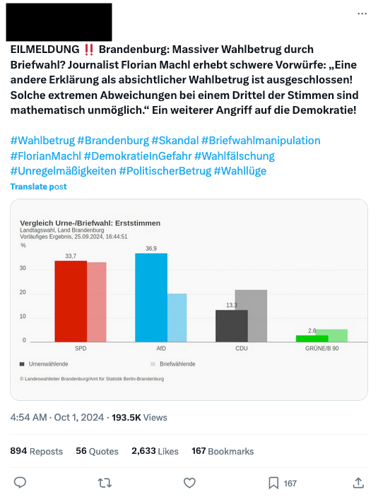 Dazu schrieb Florian Machl vom österreichischen Online-Medium Report24 am 22. September auf X: „Eine andere Möglichkeit als massiver Wahlbetrug bei den Briefwahlstimmen“ sei „völlig undenkbar“ und bezieht sich dabei offenbar auf das Ergebnis der AfD. Ähnlich äußerte er sich in einem Text für Report24. Report24 ist – wie der österreichische Online-Sender Auf1 – für das Verbreiten von Desinformation bekannt. Beide versuchten 2021 Einfluss auf die Bundestagswahl in Deutschland zu nehmen.