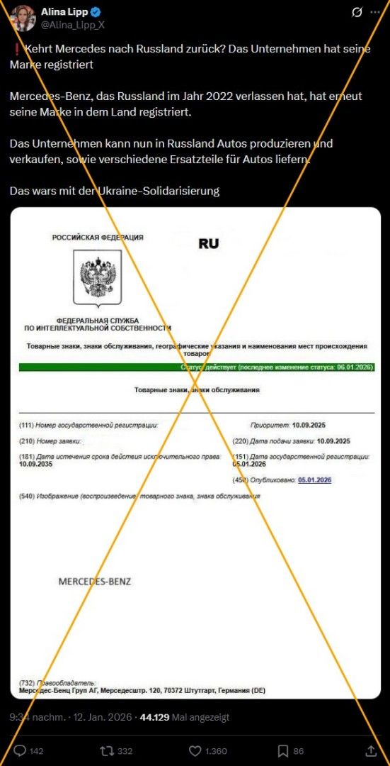 Der Stuttgarter Autohersteller Mercedes-Benz stellte nach dem russischen Angriff auf die Ukraine am 24. Februar 2022 seine Exporte nach Russland ein und stoppte die Produktion vor Ort. Doch die prorussische Bloggerin Alina Lipp spekulierte etwa in einem X-Post vom 12. Januar 2026, der mehr als 44.000 Mal angezeigt wurde: „Kehrt Mercedes nach Russland zurück?“ Ihre Begründung: „Mercedes-Benz, das Russland im Jahr 2022 verlassen hat, hat erneut seine Marke in dem Land registriert.“ Als Beleg teilte sie ein Dokument mit russischem Text. Darin sind Datumsangaben, das russische Wappen sowie der Name des Autoherstellers in lateinischer Blockschrift zu lesen. „Das wars mit der Ukraine-Solidarisierung,“ heißt es in Lipps Beitrag schließlich. AFP stellte bereits mehrere Behauptungen richtig, die sie teilte.