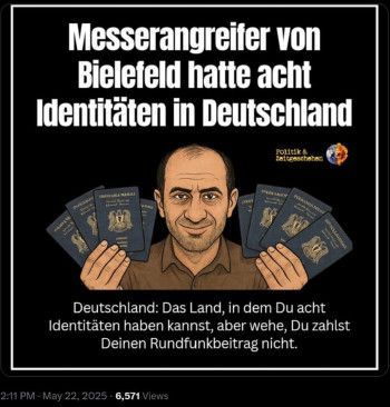 „Wie kann es sein dass der Attentäter von Bielefeld 8 Identitäten hat vom Staat 8x Bürgergeld und 8 Wohnungen bezahlt bekommt […]“, fragt eine Benutzerin am 23. Mai 2025 auf Facebook. Auch auf X kursiert die Behauptung. Quellen werden nicht genannt, in einigen Beiträgen wird jedoch ein Screenshot eines Nachrichtenbeitrags der Welt gezeigt, etwa in diesem Facebook-Beitrag der AfD-Bundestagsabgeordneten Carolin Bachmann.
