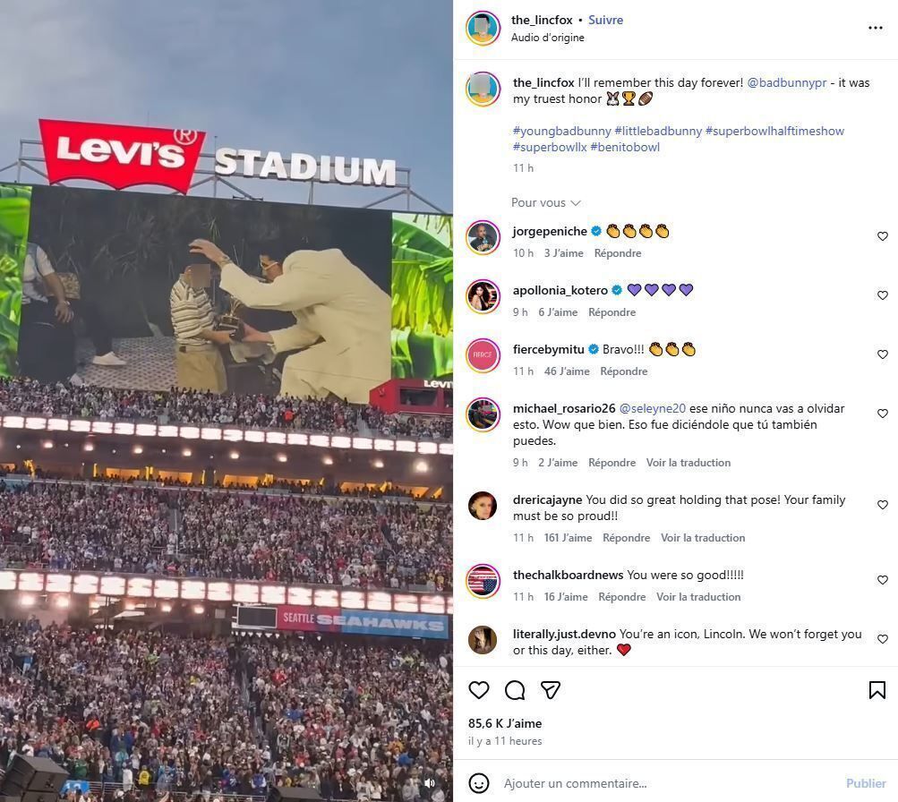 Der Beitrag wird durch ein erstes Bild illustriert, das einen Screenshot der Live-Übertragung des Super Bowl zeigt (zwischen Minute 09:06 und 09:17), auf dem das Kind gemeinsam mit Bad Bunny zu sehen ist (hier archiviert). Ein zweites Bild zeigt offenbar Bad Bunny als Kind, ähnlich gekleidet wie Lincoln Fox. Das unterstreicht die Symbolik der Szene: die Verbindung zwischen der Vergangenheit und der Zukunft des Künstlers.