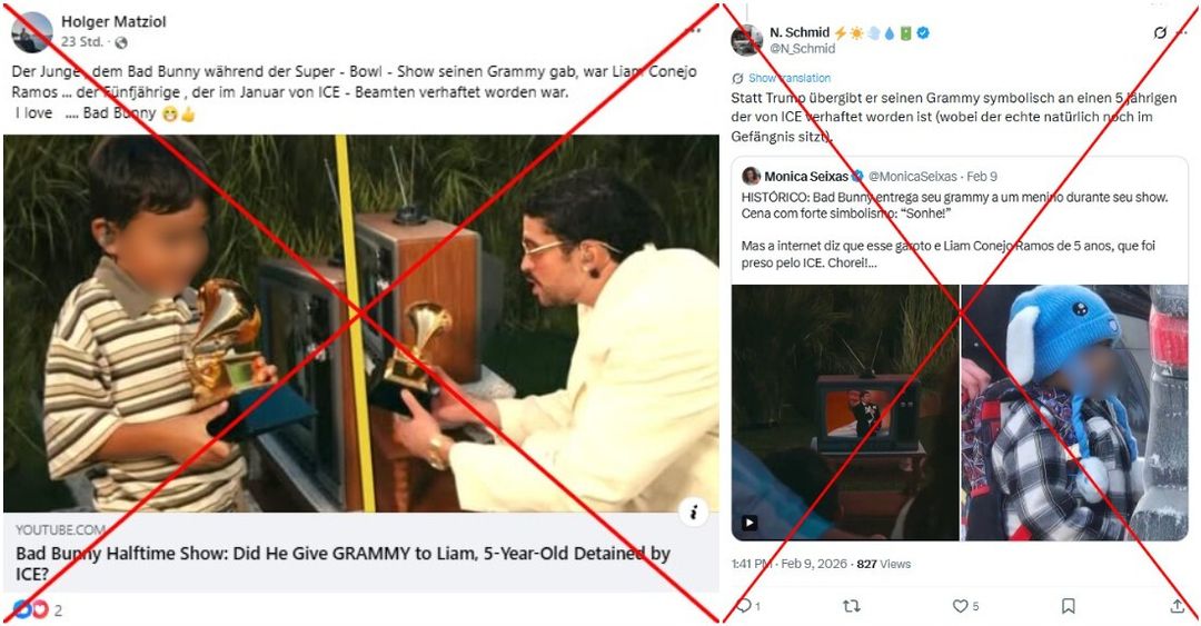 „Der Junge , dem Bad Bunny während der Super – Bowl – Show seinen Grammy gab, war Liam Conejo Ramos … der Fünfjährige , der im Januar von ICE – Beamten verhaftet worden war. I love …. Bad Bunny“, schrieb ein User in diesem Zusammenhang am 9. Februar 2026 auf Facebook. Die Behauptung wurde auch auf X geteilt. Sie kursierte zudem in anderen Sprachen wie Französisch, Englisch, Spanisch, Portugiesisch und Türkisch.