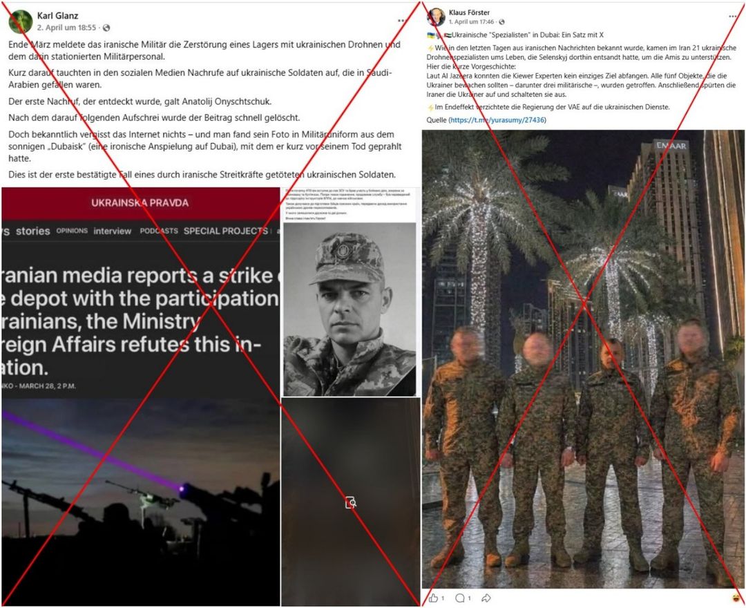 „Dies ist der erste bestätigte Fall eines durch iranische Streitkräfte getöteten ukrainischen Soldaten“, lautet die Facebook-Beschreibung zu einem schwarzweißen Bild eines Mannes in Militäruniform am 2. April 2026. Ein angeblicher Nachruf aus den Vereinigten Arabischen Emiraten (VAE) ist auf den Namen Anatoli Onischtschuk ausgestellt, dieser soll auch auf den geteilten Fotos zu sehen sein. In einem anderen Facebook-Beitrag vom 1. April 2026 wurde ein weiteres Bild geteilt, das vier Soldaten zeigt, darunter auch Onischtschuk, wie es heißt. Laut der Behauptung seien „21 ukrainische Drohnenspezialisten ums Leben“ gekommen, „die Selenskyj dorthin entsandt hatte, um die Amis zu unterstützen“.