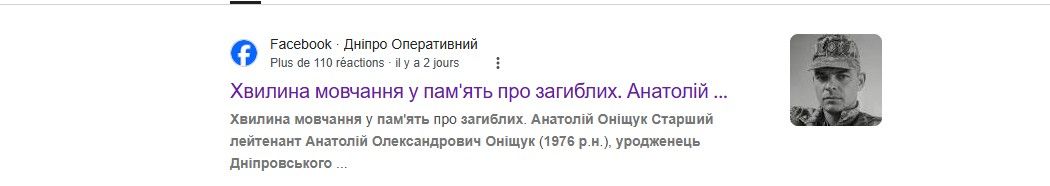 Eine umgekehrte Bildsuche über Google führte zu einer Veröffentlichung von „Dnipro Preratyvnyi“, die inzwischen nicht mehr verfügbar ist. Die Vorschau des Suchergebnisses zeigt jedoch, dass diese Seite tatsächlich einen Beitrag mit dem Porträt, auf dem das Gesicht des oben erwähnten „Helden Mikola Syschchyk“ verjüngt war, veröffentlicht hatte. In der Vorschau ist ein Textauszug zu lesen, der lautet: „Eine Schweigeminute für die Vermissten. Leutnant Anatoli Oleksandrowytsch Onischtschuk (geboren 1976), aus Dnipro“.