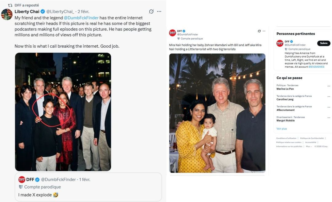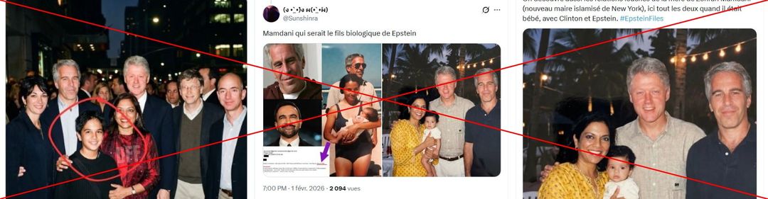 „Man entdeckt auch die zwielichtigen Beziehungen der Mutter von Zohran Mamdani (dem neuen islamisierten Bürgermeister von New York), hier beide, als er noch ein Baby war, mit Clinton und Epstein“, schrieb ein X-Nutzer am 2. Februar 2026 auf Französisch. Er griff dabei ein Bild auf, das ursprünglich von US-amerikanischen rechten Influencern geteilt worden war.