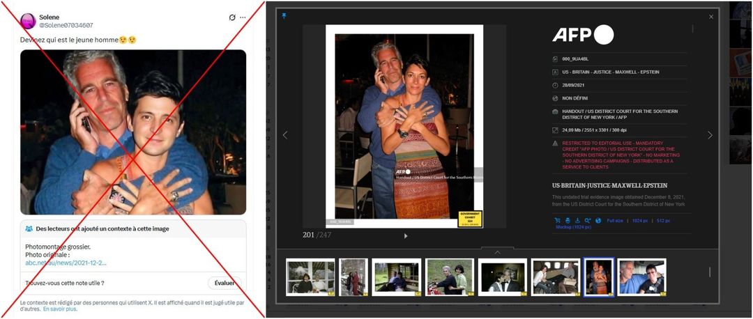 In sozialen Medien kursierte eine Fotomontage, die Epstein zeigt, wie er einen jungen Mann umarmt, der dem ukrainischen Präsidenten Wolodymyr Selenskyj ähnlich sieht. Versehen mit der Beschreibung „Ratet mal, wer dieser junge Mann ist?“, verbreitete sich das Bild auf X etwa auf Französisch. Es kursierte zudem mit Beschreibungen in zahlreichen anderen Sprachen wie Englisch.