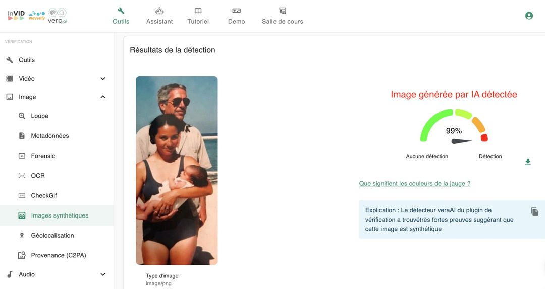 Dies gilt auch für ein weiteres Bild, das in den vergangenen Tagen in sozialen Medien mit der Behauptung verbreitet wurde, es zeige Nair an einem Strand in Begleitung von Epstein: Analysen mit dem Verifizierungstool InVID WeVerify, das von AFP mitentwickelt wurde, ergaben jedoch, dass auch dieses Bild KI-generiert ist.